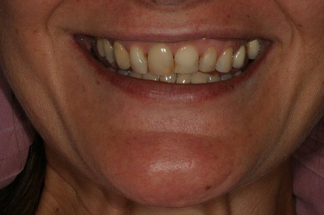 This patient had leaking porcelain crowns causing them to turn dark gray.