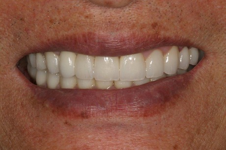 porcelain crowns, replaced her missing teeth with dental implants, this