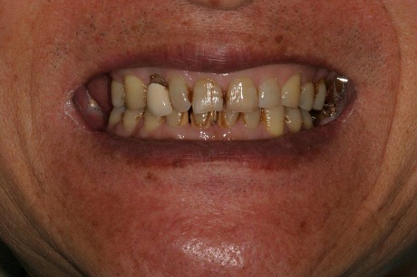 This 67 year old patient came in with old crowns, bad gums, root decay,